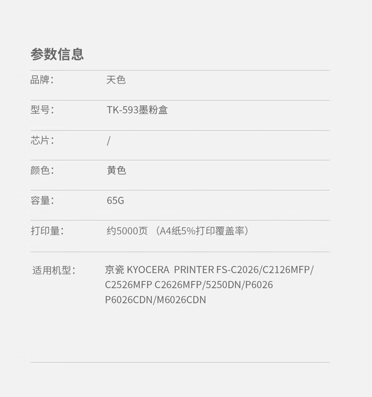 | 产品名称 : | 天色 粉盒 TK593 黄色Y (适用于Kyocera PRINTER FS-C2026/)阳光旗舰版 |