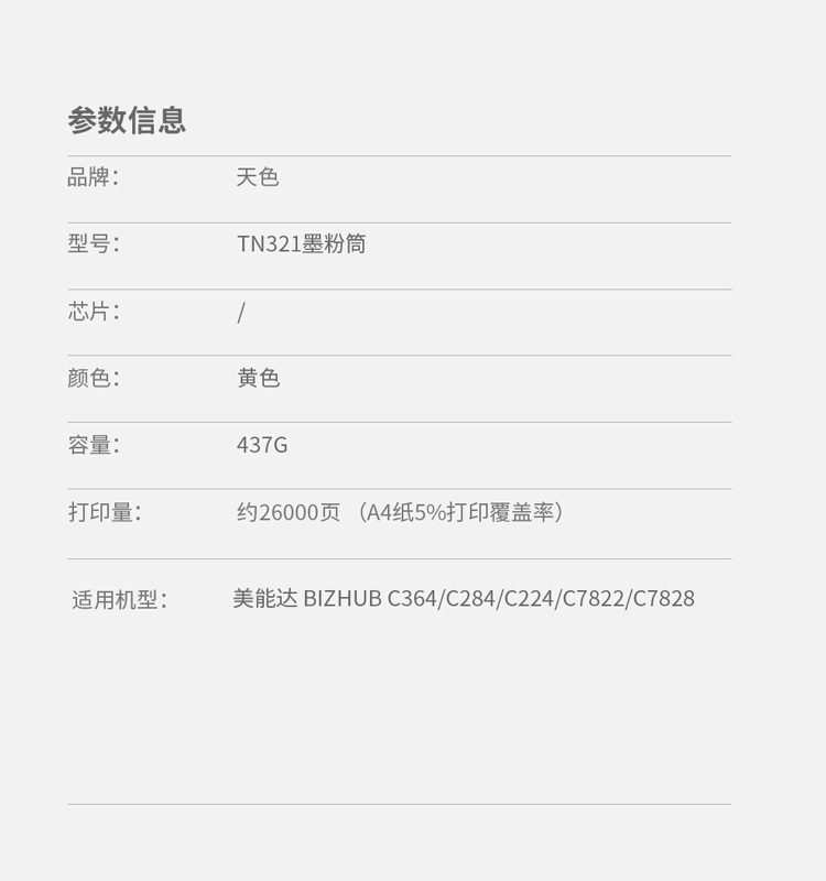 > 办公耗材 复印纸 硒鼓 > 打印耗材 > 硒鼓 > 天色 粉盒 TN321 黄色Y (适用于KonicaMinoltabizhubC364/C284/C224/C7822/C7828)阳光旗舰版| 产品名称 : | 天色 粉盒 TN321 黄色Y (适用于KonicaMinoltabizhubC364/C284/C224/C7822/C7828)阳光旗舰版 |