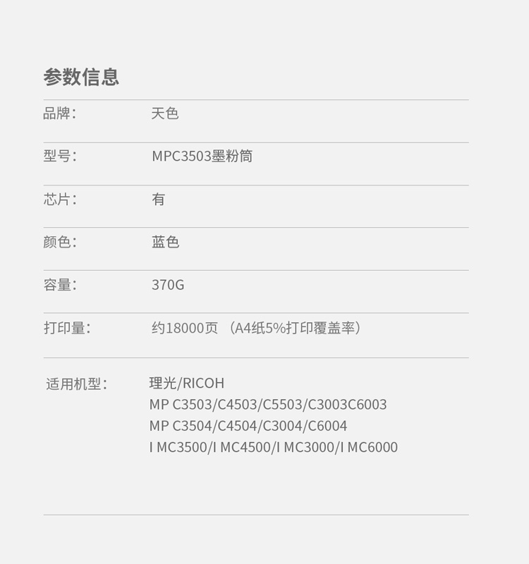 | 产品名称 : | 天色 碳粉 理光 MP C3503青蓝色C (适用于Ricoh MPC3503/C3003SP/C3503)阳光旗舰版 |
