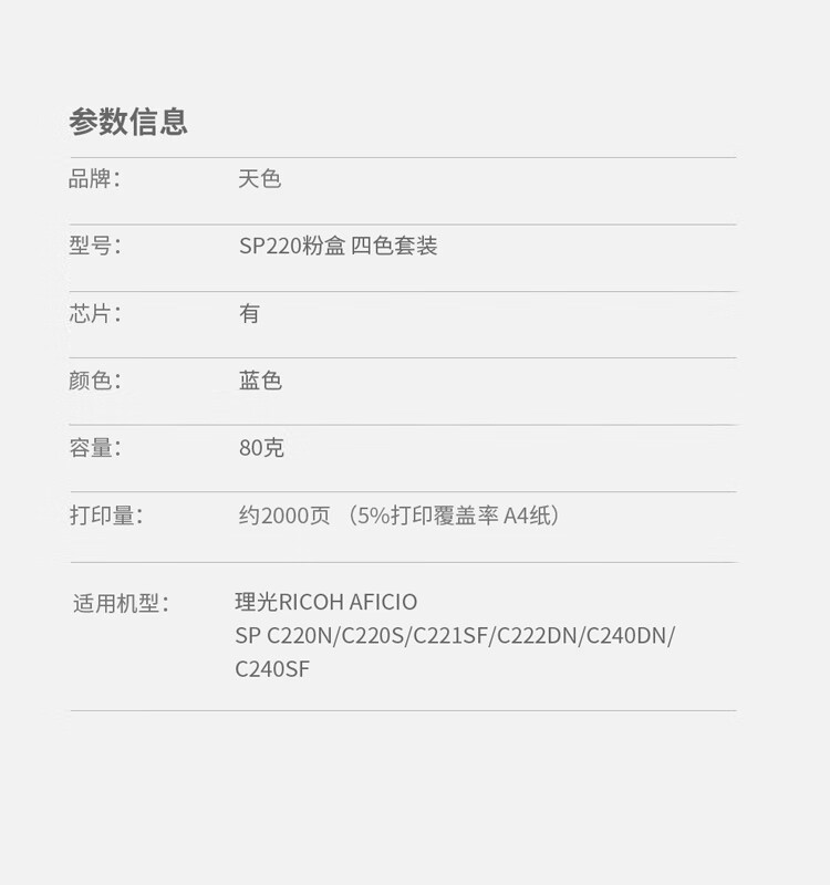 产品名称 : 天色 硒鼓 SPC220 青蓝色C (适用于Ricoh AFICIO SP C220N/C220S/C221SF/C222DN/C240DN/C240SF)阳光旗舰版