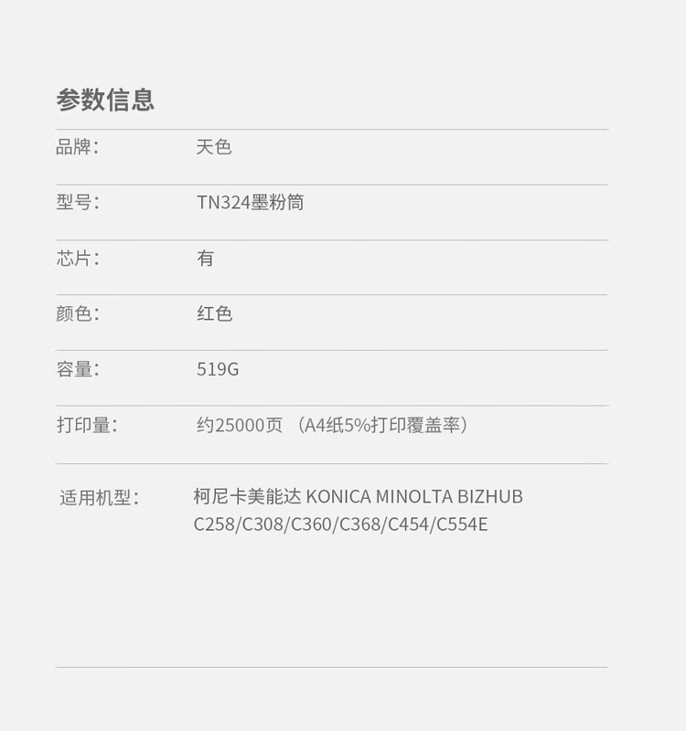 > 办公耗材 复印纸 硒鼓 > 打印耗材 > 硒鼓 > 天色 粉盒 TN324 洋红色M (适用于Konica Minolta bizhub C258/C308/C360/C368/C454/C554E)阳光旗舰版| 产品名称 : | 天色 粉盒 TN324 洋红色M (适用于Konica Minolta bizhub C258/C308/C360/C368/C454/C554E)阳光旗舰版 |
