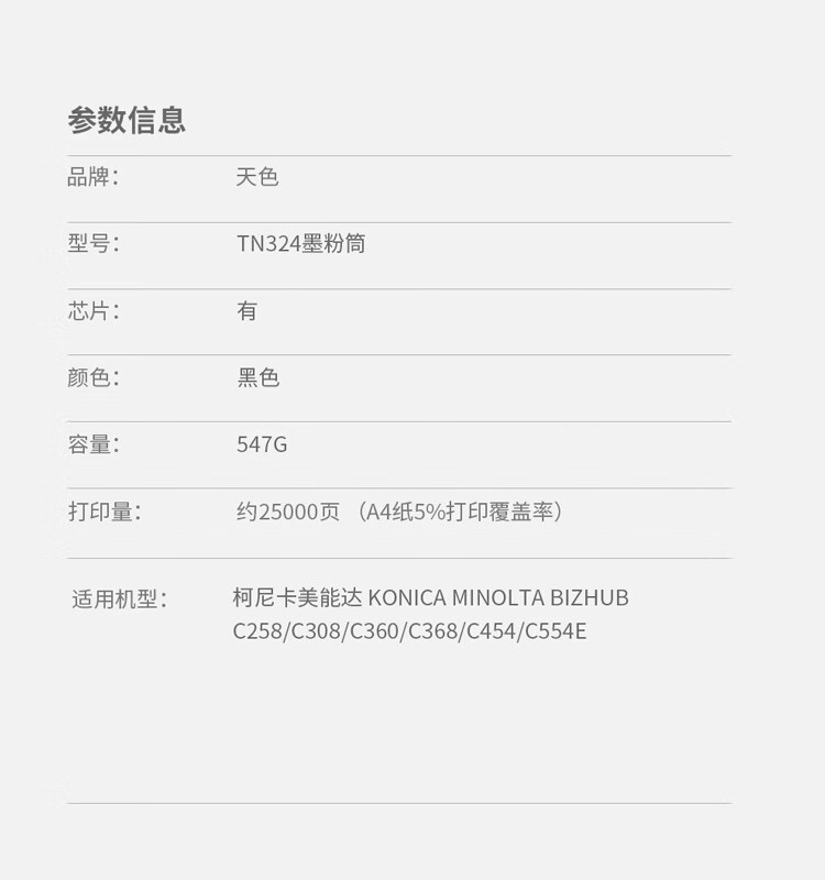 > 办公耗材 复印纸 硒鼓 > 打印耗材 > 硒鼓 > 天色 粉盒 TN324 黑色K (适用于Konica Minolta bizhub C258/C308/C360/C368/C454/C554E)阳光旗舰版| 产品名称 : | 天色 粉盒 TN324 黑色K (适用于Konica Minolta bizhub C258/C308/C360/C368/C454/C554E)阳光旗舰版 |
