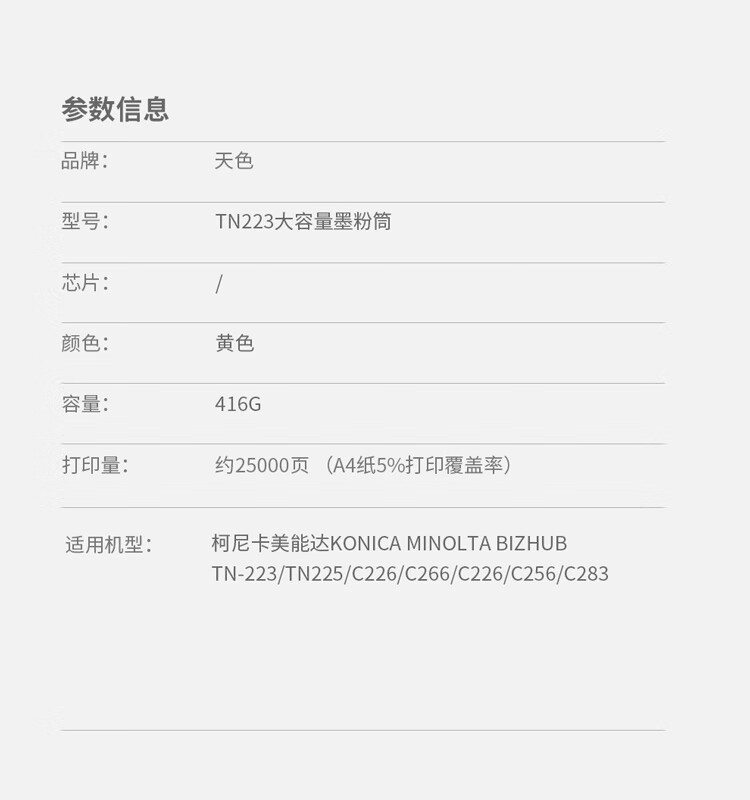> 办公耗材 复印纸 硒鼓 > 打印耗材 > 硒鼓 > 天色 粉盒 TN223 大容量黄色Y (适用于Konica Minolta bizhub TN-223/TN225/C226/C266/C256/C283)阳光旗舰版| 产品名称 : | 天色 粉盒 TN223 大容量黄色Y (适用于Konica Minolta bizhub TN-223/TN225/C226/C266/C256/C283)阳光旗舰版 |