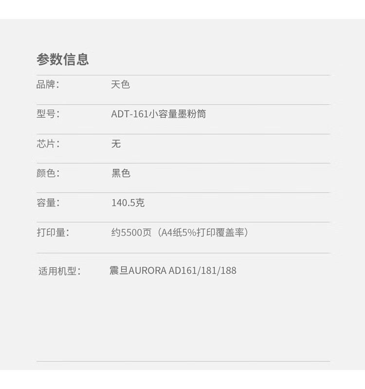 | 产品名称 : | 天色 碳粉 震旦ADT161(适用于 AURORAAD161/181/188)阳光旗舰版 |