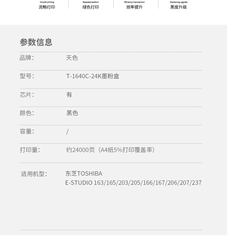 > 办公耗材 复印纸 硒鼓 > 打印耗材 > 硒鼓 > 天色 粉盒 兼容东芝T-1640 24K(适用于 Toshiba E-STUDIO 163/165/166/167/203/205)阳光旗舰版 Z| 产品名称 : | 天色 粉盒 兼容东芝T-1640 24K(适用于 Toshiba E-STUDIO 163/165/166/167/203/205)阳光旗舰版 Z |