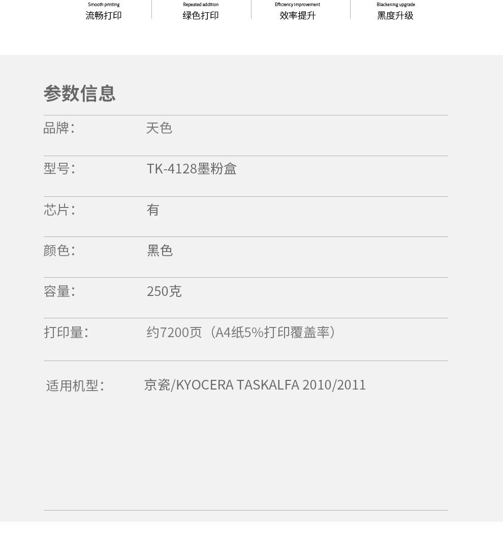 产品名称 : 天色 粉盒 兼容京瓷TK4128(适用于 Kyocera TASKALFA 2010/2011/2210/2211)阳光旗舰版 Z