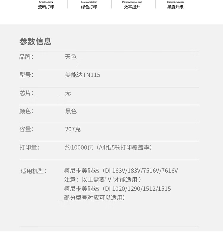 > 办公耗材 复印纸 硒鼓 > 打印耗材 > 硒鼓 > 天色 碳粉 美能达TN115(适用于 KonicaMinoltaDI-163/183/1020/1290/1512/1515/1518/7516/)阳光旗舰版| 产品名称 : | 天色 碳粉 美能达TN115(适用于 KonicaMinoltaDI-163/183/1020/1290/1512/1515/1518/7516/)阳光旗舰版 |