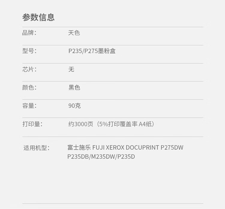 | 产品名称 : | 天色 粉盒 兼容施乐 P235/P275(适用于 Xerox CT202332 )阳光旗舰版 |
