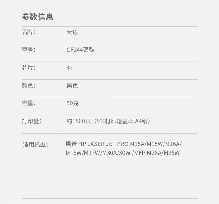 | 产品名称 : | 天色 粉盒 CF244A (适用于 HP M15a/M15w/M28a/M28w)阳光旗舰版 |