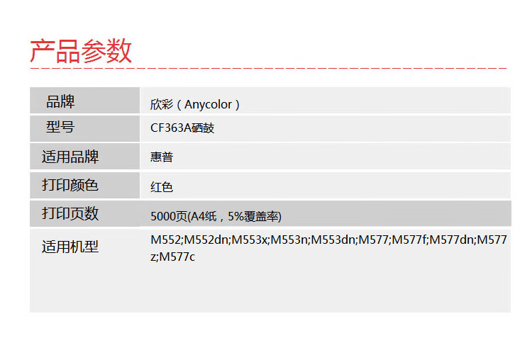 > 办公耗材 复印纸 硒鼓 > 打印耗材 > 硒鼓 > 欣彩(Anycolor)CF363A硒鼓(专业版)508A红色 AR-M552M适用HP惠普M552dn M553x M553n M553dn M577dn| 产品名称 : | 欣彩(Anycolor)CF363A硒鼓(专业版)508A红色 AR-M552M适用HP惠普M552dn M553x M553n M553dn M577dn |