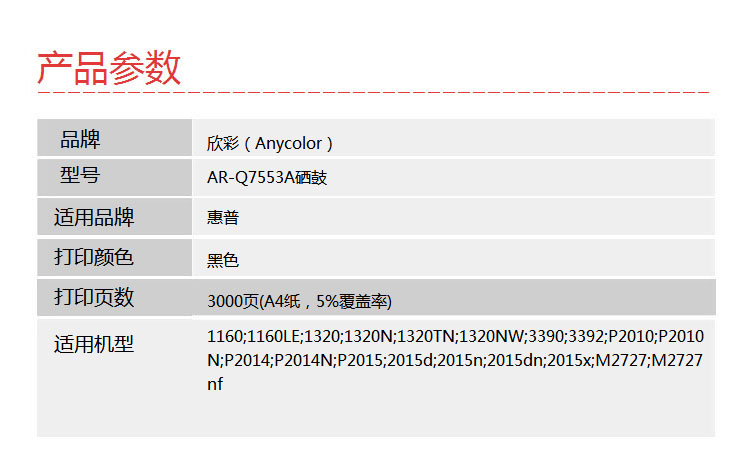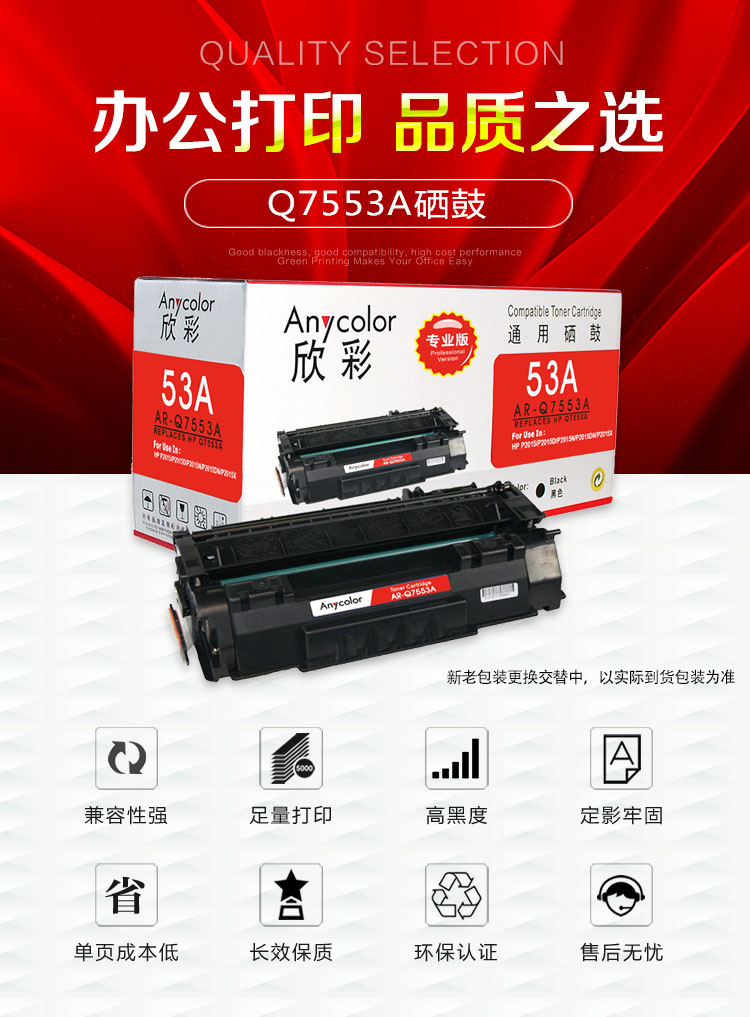 | 产品名称 : | 欣彩(Anycolor)AR-Q7553A硒鼓(专业版)HP53A 适用惠普hp P2014 p2015 M2727nf |