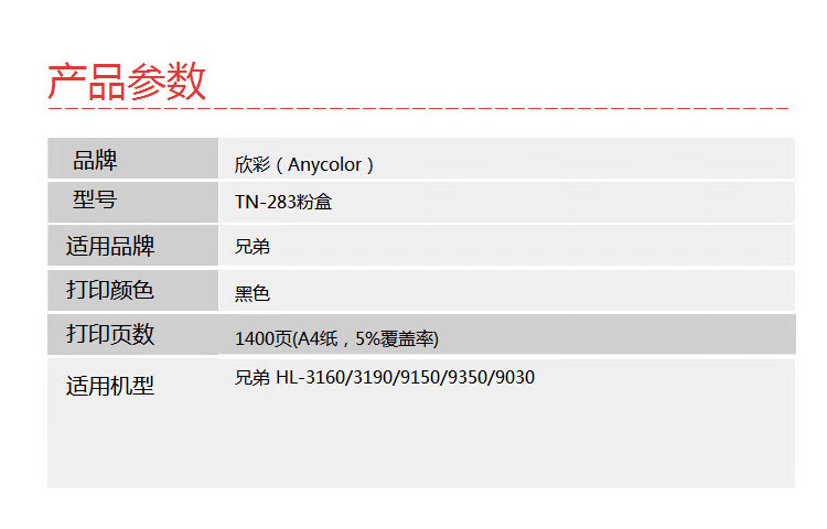 > 办公耗材 复印纸 硒鼓 > 打印耗材 > 硒鼓 > 欣彩(Anycolor)TN-283粉盒 专业版 AR-TN283K墨粉盒 黑色 适用兄弟 HL-3160 3190 9150 9350 9030| 产品名称 : | 欣彩(Anycolor)TN-283粉盒 专业版 AR-TN283K墨粉盒 黑色 适用兄弟 HL-3160 3190 9150 9350 9030 |