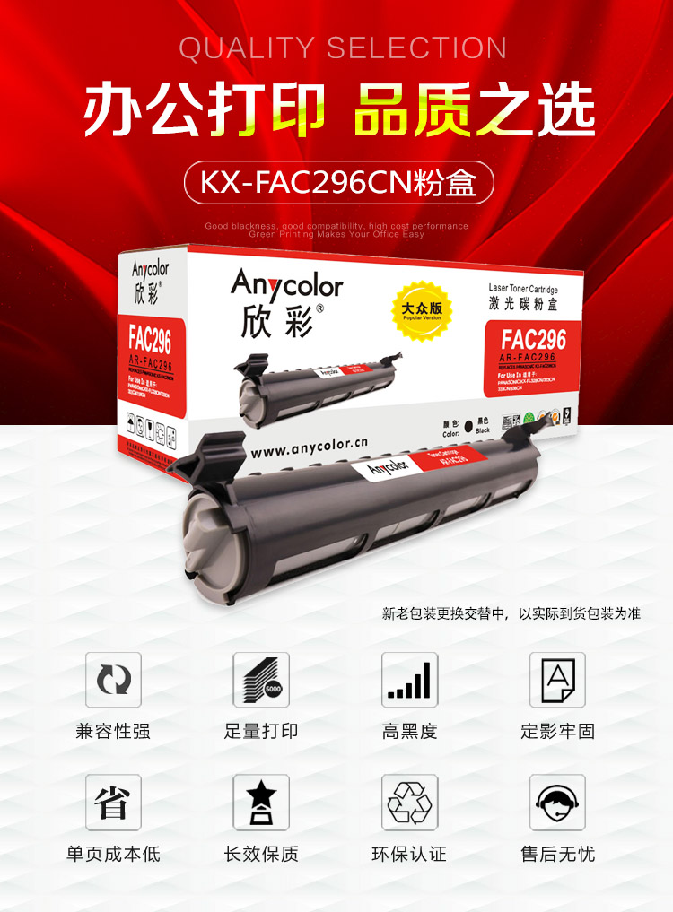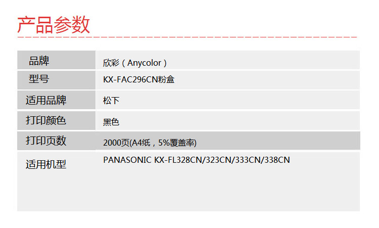 > 办公耗材 复印纸 硒鼓 > 打印耗材 > 硒鼓 > 欣彩(Anycolor)KX-FAC296CN粉盒 大众版 AR-FAC296黑色墨粉盒 适用松下KX-FL323CN 328CN 333CN 338CN| 产品名称 : | 欣彩(Anycolor)KX-FAC296CN粉盒 大众版 AR-FAC296黑色墨粉盒 适用松下KX-FL323CN 328CN 333CN 338CN |