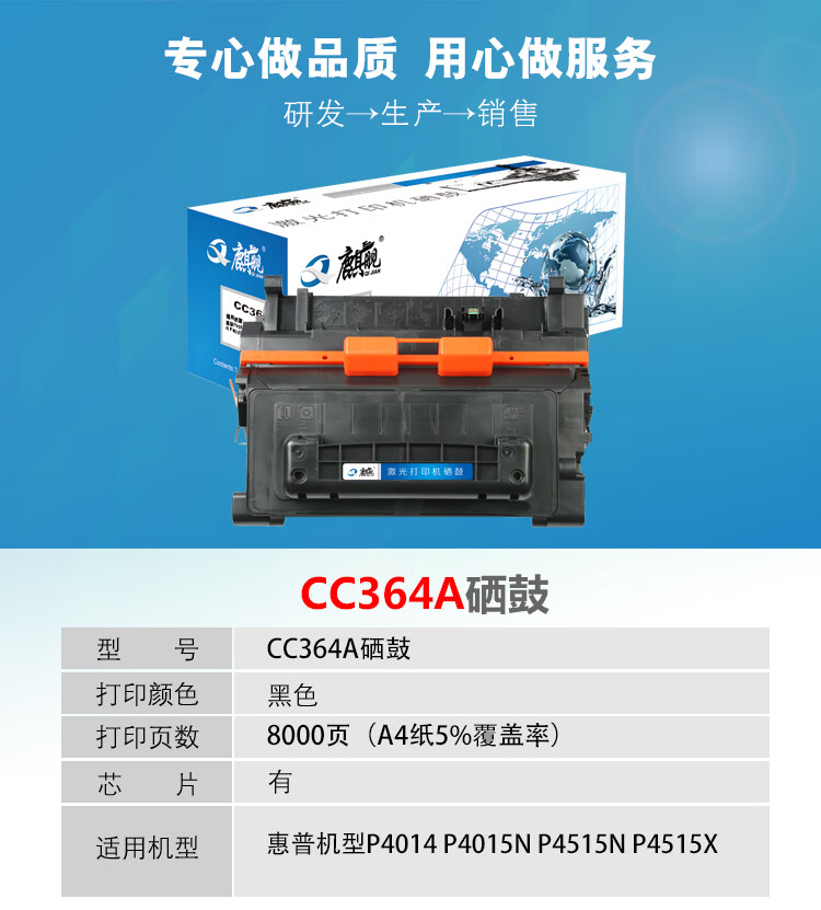 | 产品名称 : | 麒舰 CC364A 黑色硒鼓适用惠普P4014 P4015N P4515N P4515X硒鼓 |