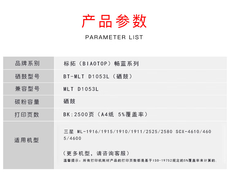 > 办公耗材 复印纸 硒鼓 > 打印耗材 > 硒鼓 > 标拓 (Biaotop) MLTD1053L硒鼓适用三星1916/1915/1910/2525/2580 SCX-4610/4605/4600打印机 畅蓝系列| 产品名称 : | 标拓 (Biaotop) MLTD1053L硒鼓适用三星1916/1915/1910/2525/2580 SCX-4610/4605/4600打印机 畅蓝系列 |