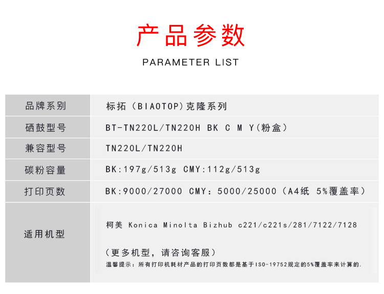 > 办公耗材 复印纸 硒鼓 > 打印耗材 > 硒鼓 > 标拓 (Biaotop) TN220标准容量红色墨粉筒适用柯美bizhub C221/281/C7122/C7128复印机 克隆系列| 产品名称 : | 标拓 (Biaotop) TN220标准容量红色墨粉筒适用柯美bizhub C221/281/C7122/C7128复印机 克隆系列 |