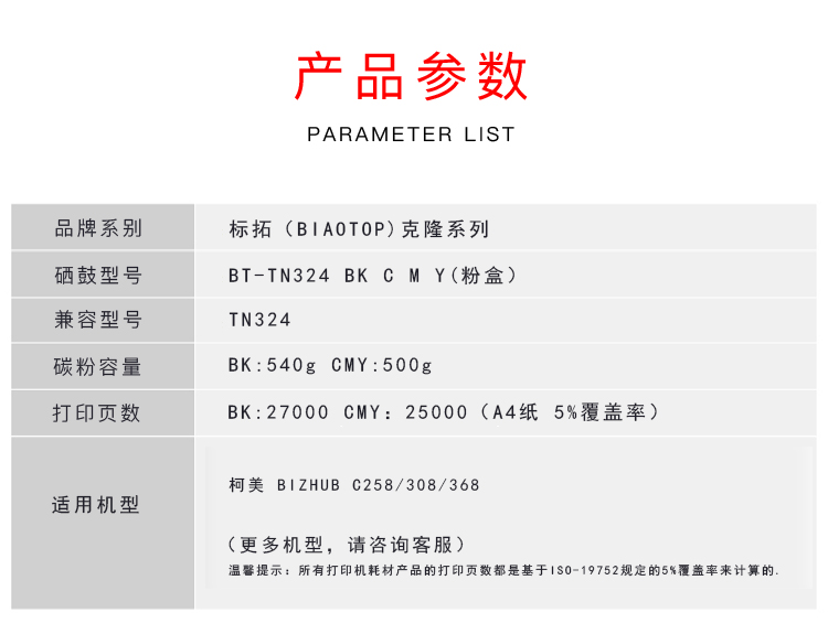 | 产品名称 : | 标拓 (Biaotop) TN324蓝色墨粉筒适用柯美bizhub C258/C308/C368复印机 克隆系列 |