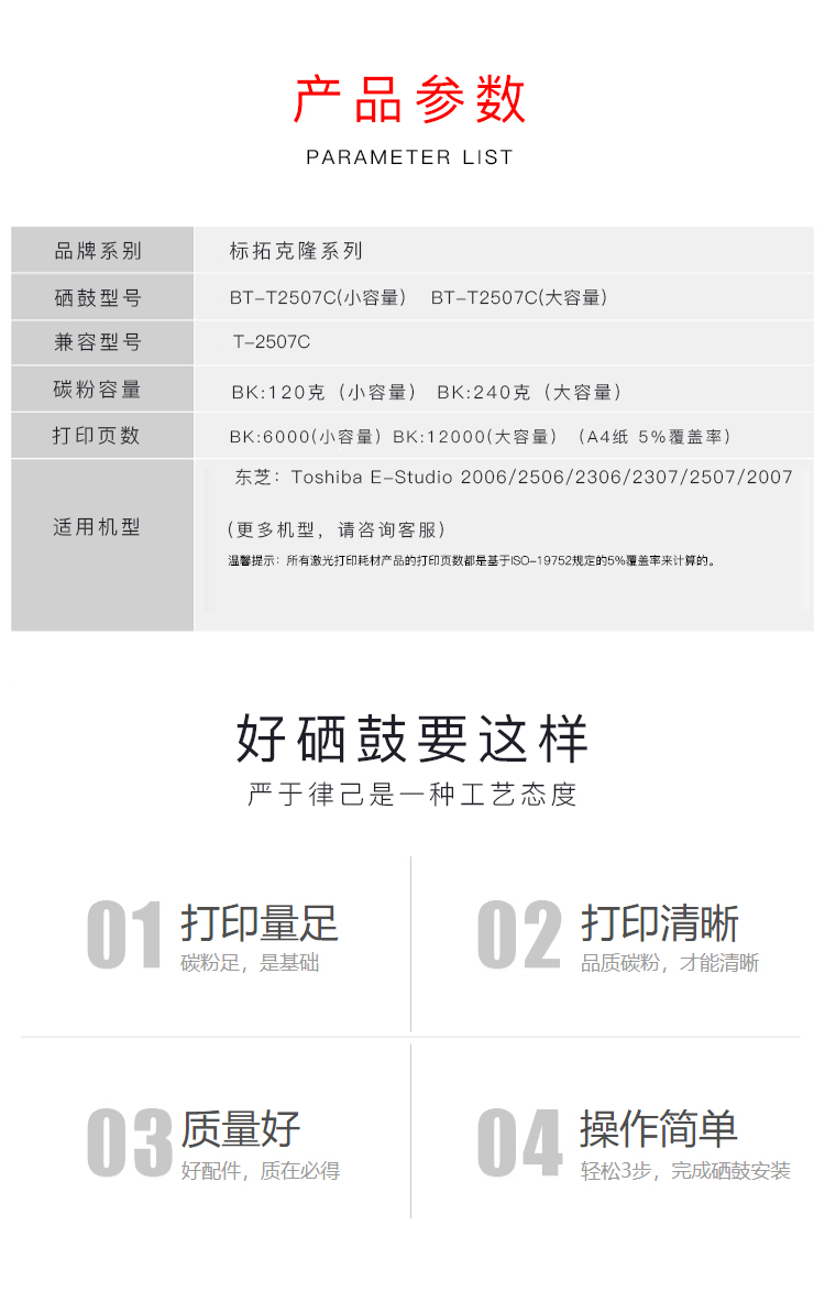 > 办公耗材 复印纸 硒鼓 > 打印耗材 > 硒鼓 > 标拓 (Biaotop) T2507小容量黑色粉盒适用东芝2006/2506/2306/2307/2507/2007复印机 克隆系列| 产品名称 : | 标拓 (Biaotop) T2507小容量黑色粉盒适用东芝2006/2506/2306/2307/2507/2007复印机 克隆系列 |