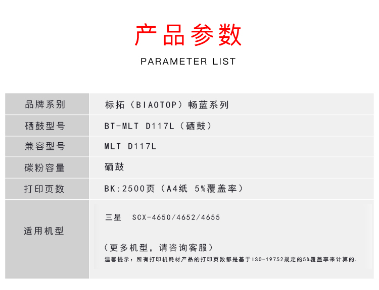 > 办公耗材 复印纸 硒鼓 > 打印耗材 > 硒鼓 > 标拓 Biaotop BT-MLT D117L 硒鼓 畅蓝系列 黑色 适用三星SCX-4650 4652 4655 计价单位:支| 产品名称 : | 标拓 Biaotop BT-MLT D117L 硒鼓 畅蓝系列 黑色 适用三星SCX-4650 4652 4655 计价单位:支 |