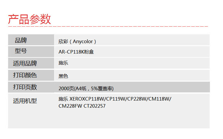 产品名称 : 欣彩 CP118 黑色粉盒(专业版)AR-CP118K 适用施乐CP 118W 119W 228W CM228FW 墨粉筒 CT202257