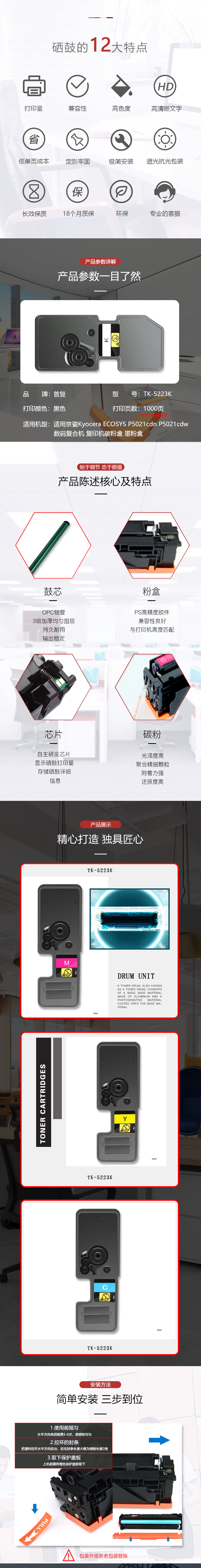 | 产品名称 : | 首复 TK-5223K 黑色粉盒 适用京瓷Kyocera ECOSYS P5021cdn P5021cdw数码复合机 |