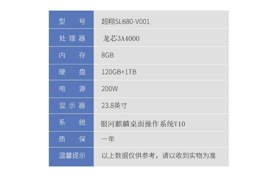 | 产品名称 : | 清华同方(THTF)台式机商务办公23.8吋超翔SL680-V001龙芯3A4000全国产化8G/120G+1T/1G独显 光驱 系统+软件 |
