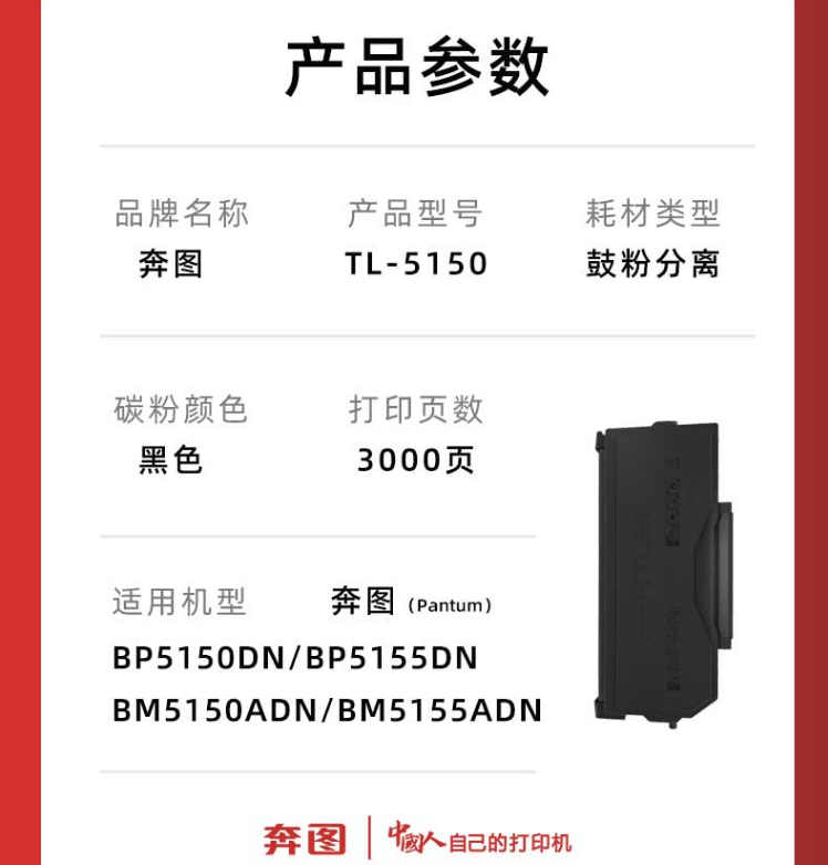 > 办公耗材 复印纸 硒鼓 > 打印耗材 > 墨粉 > 奔图(PANTUM)原装TL-5150黑色粉盒适用BP5150DN/BP5150DN/BM5150ADN/BM5155ADN打印机硒鼓(1500页)| 产品名称 : | 奔图(PANTUM)原装TL-5150黑色粉盒适用BP5150DN/BP5150DN/BM5150ADN/BM5155ADN打印机硒鼓(1500页) |