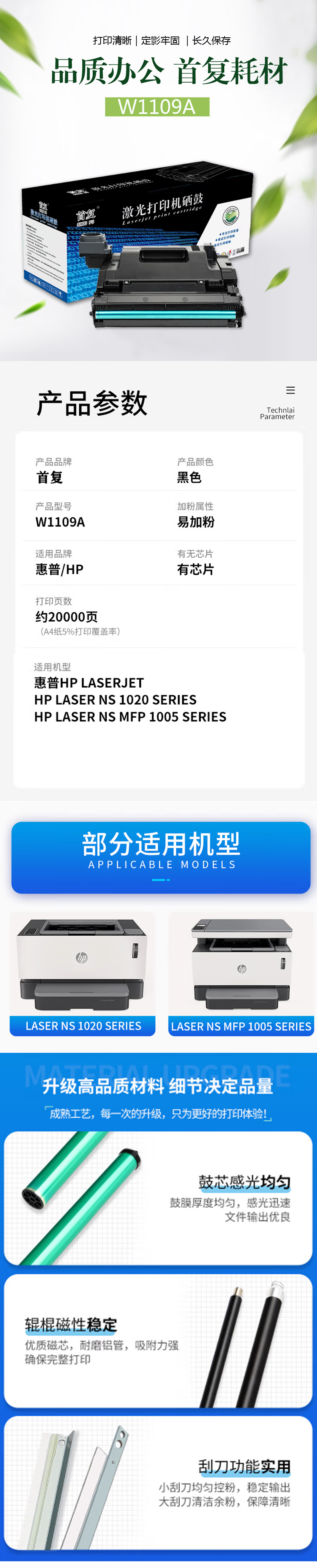 | 产品名称 : | 首复W1109A成像鼓 适用惠普1005w硒鼓 ns1020c/w粉盒 1005c墨粉108a智能闪充粉盒W1108AD |